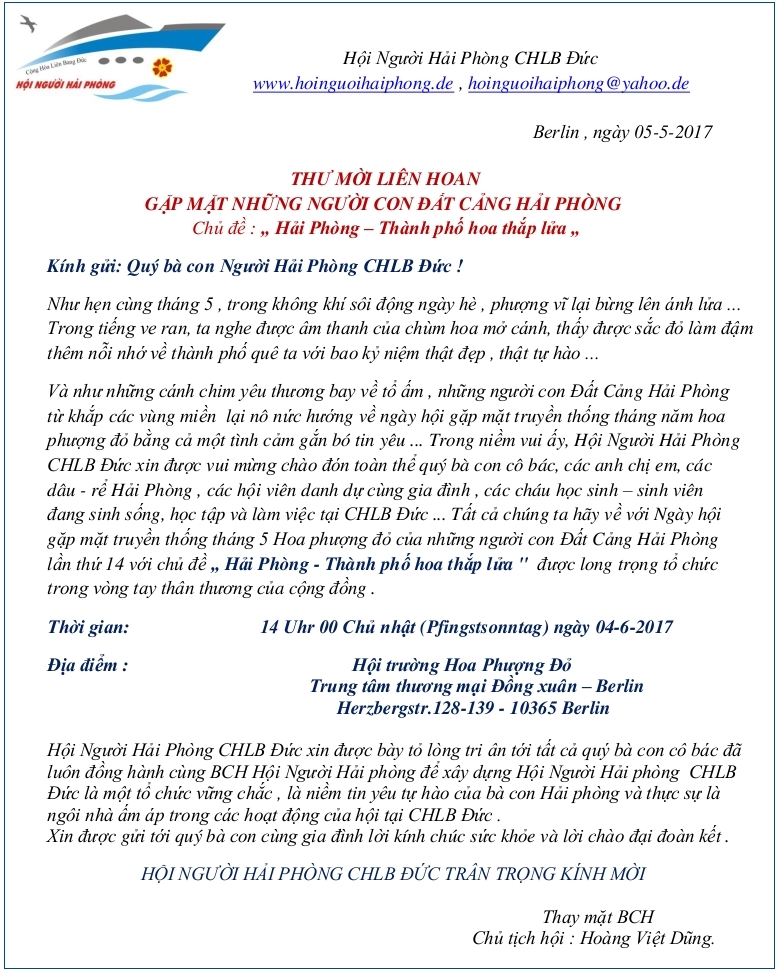 MỜI LIÊN HOAN GẶP MẶT NHỮNG NGƯỜI CON ĐẤT CẢNG HẢI PHÒNG 04.06.2017 tại Berlin