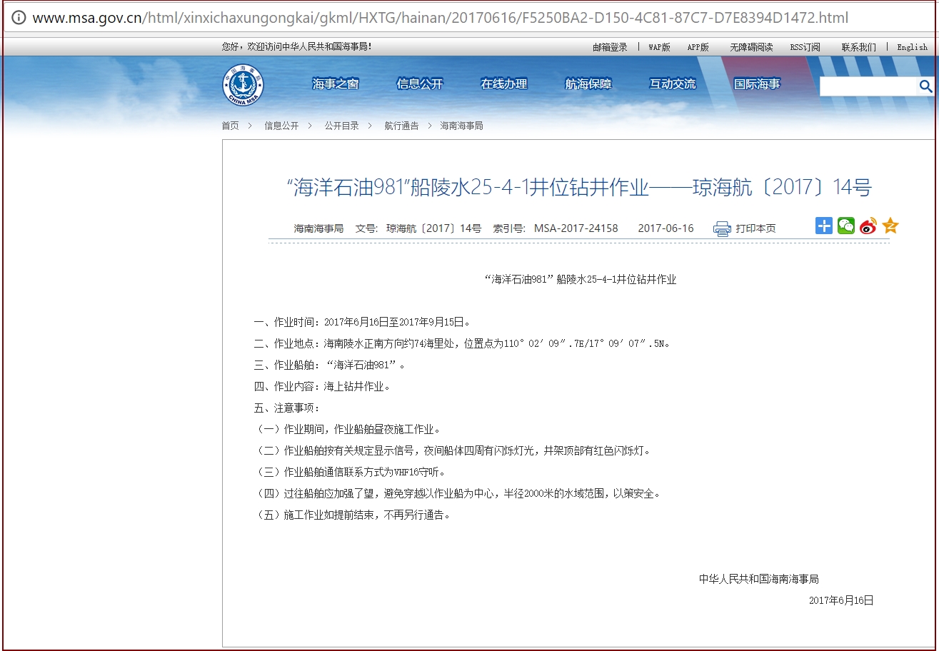 Thông báo trên trang Cục Hải sự Trung Quốc về việc nước này đưa giàn khoan 981 vào khu vực ngoài cửa Vịnh Bắc Bộ ở Biển Đông từ ngày 16.6.2017 đến ngày 15.9.2017.
