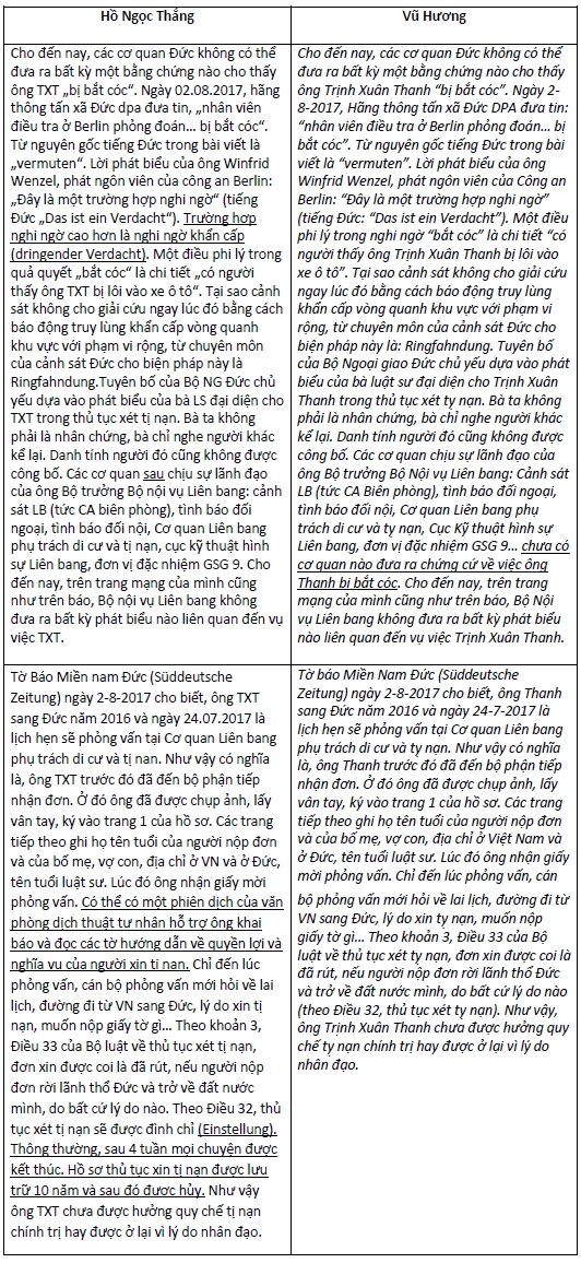 Trở lại bài báo nhục mạ Bộ Ngoại giao Đức của tác giả Vũ Hương, tất cả những lập luận và lý luận đều được lấy từ bài viết nhiều tai tiếng của Hồ Ngọc Thắng mang tựa đề „Quan hệ ngoại giao Đức-Việt sẽ ra sao sau vụ việc TXT?„. Thậm chí giống nhau hầu như không khác một chữ: