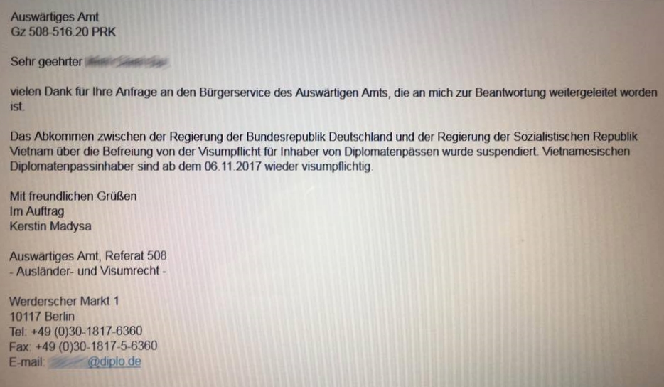 Từ ngày 6.11.2017, những người mang hộ chiếu ngoại giao Việt Nam không còn được tự do tới Đức nếu chưa xin Visa nhập cảnh.