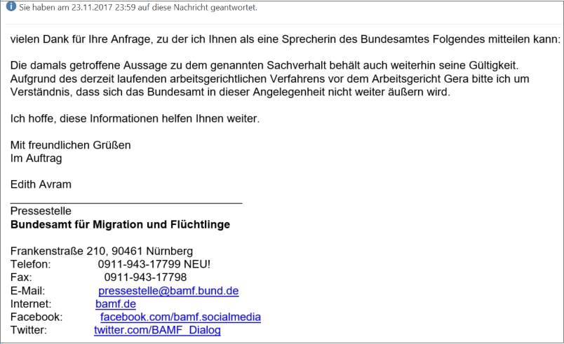Theo thông tin thoibao.de nhận được, hiện nay ông H. Ngọc Thắng đang kiện Cơ quan Liên bang Đức về nhập cư và tị nạn (BAMF) tại Tòa án lao động thành phố Gera về việc bị cho thôi việc. Không phải ông H Ngọc Thắng mới vừa bắt đầu khởi kiện mà ông đã đưa đơn kiện sau khi ông bị đuổi việc vĩnh viễn.