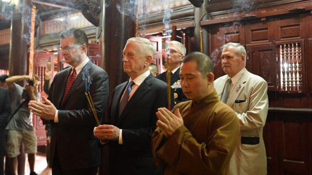 Không biết ông Mattis có mê tín hay không, nhưng ngày 25/1/2018 giữa các cuộc gặp cấp cao, đã đến thăm chùa Trấn Quốc (tại Hồ Tây, Hà Nội) như để “cầu an”. Trao đổi với nhà sư trụ trì, ông Mattis ca ngợi không gian thanh bình của ngôi chùa cổ gắn liền với sự ra đời của nhà nước đầu tiên ở Việt Nam. Sự quan tâm đến lịch sử, văn hóa Việt Nam của ông Mattis cho thấy ông muốn tạo dựng lòng tin với người Việt. Theo tiến sỹ Lê Hồng Hiệp, chuyến viếng thăm chùa Trấn Quốc của Bộ trưởng Quốc phòng Mỹ “mang tính biểu tượng để gửi đi một thông điệp về sự tôn trọng và hiểu biết về lịch sử của ông Mattis đối với Việt Nam”. (“Tàu sân bay Mỹ sẽ có chuyến thăm lịch sử tới Việt Nam”, VOA, 26/01/2018).